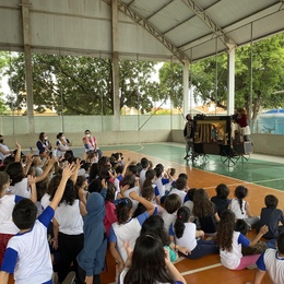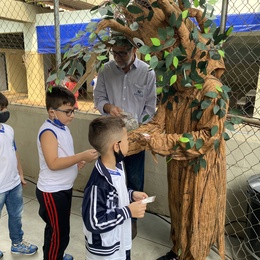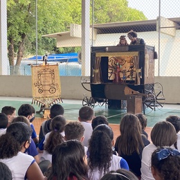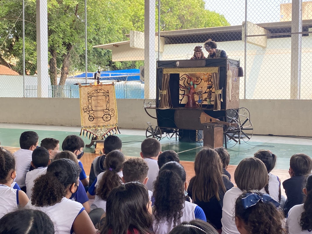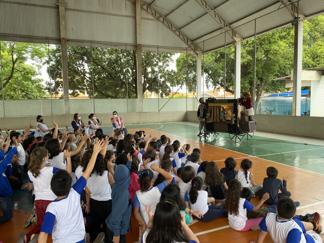 A carruagem foi estacionada na quadra de esportes da EMEB e, com a ajuda de marionetes, levou as crianças a refletirem sobre o meio ambiente e a água. A árvore, confeccionada pela GS Inima SAMAR, também chamou a atenção e, ao fim das apresentações, foi responsável por entregar sementes de embaúba aos estudantes.