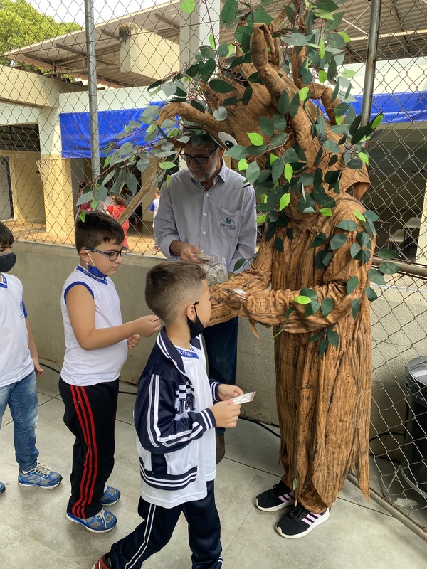 Alunos da EMEB Professora Carmelia Mello Fonseca, do bairro Aclimação, receberam ontem, no Dia da Árvore (21 de setembro), apresentação da Carruagem de Histórias, da Cia. Nuvem & Feijão. O evento contou ainda com distribuição de sementes de embaúba e de um personagem vestido de árvore que chamou a atenção de todos.