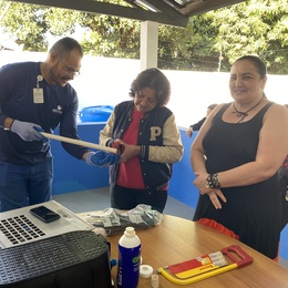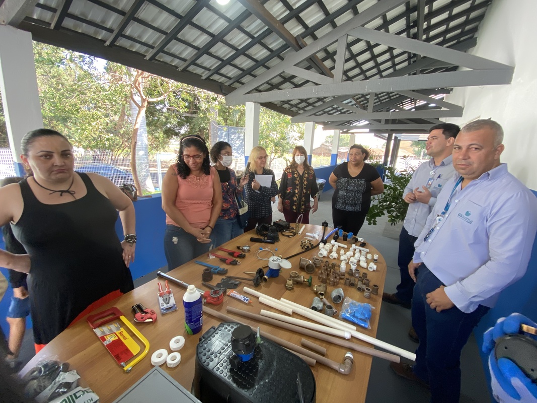Diversas peças hidráulicas, como canos soldáveis, luvas, roscas e cotovelos, e equipamentos como chaves de fenda, hidrômetros e geofones foram apresentados às participantes e utilizados durante as aulas práticas. Elas aprenderam a trocar a boia da caixa d’água, consertar uma torneira, identificar e reparar um vazamento no encanamento, entre outras atividades.