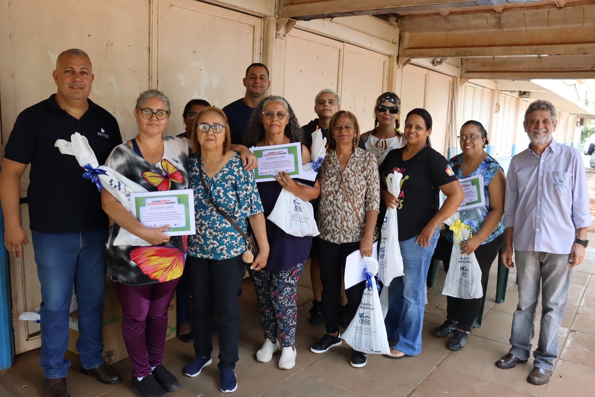 Ao final do curso, as participantes receberam certificado e um kit com peças, como lixas, pedaço de cano soldável, luvas, serra, fita veda rosca e cotovelo.