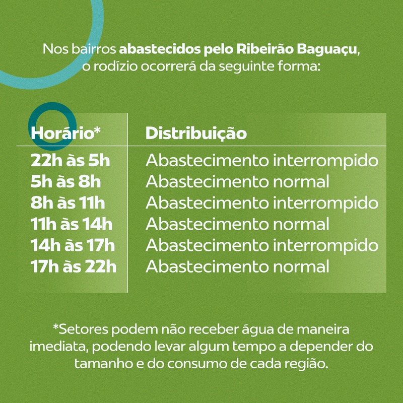 Nos 77 bairros e condomínios abastecidos diretamente pelo Ribeirão Baguaçu e nos 17 bairros e condomínios que recebem reforços de abastecimento do manancial, o rodízio ocorrerá da seguinte forma: