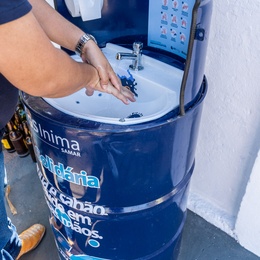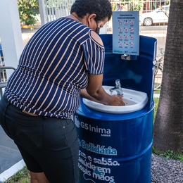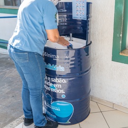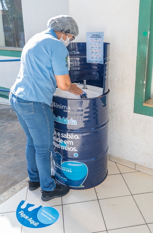 A pia solidária, acoplada num suporte de tambor, disponibiliza água tratada e sabão para que a população possa higienizar as mãos em locais de acesso a serviços essenciais onde há um grande fluxo de pessoas. Anexo à pia, um informativo orienta sobre a forma correta de lavagem das mãos, para se proteger contra o vírus transmissor da doença.
