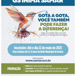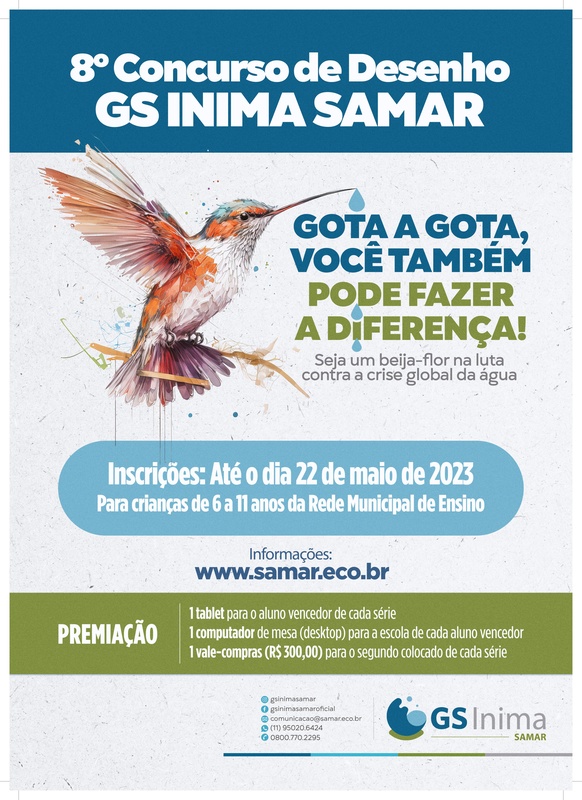 A GS Inima SAMAR lança, no Dia Mundial da Água (22 de março), o 8º Concurso de Desenho. O evento de lançamento ocorrerá às 9h, na EMEB Profª Maria Mercedes Cassiolato de Souza, no Bairro Atlântico. Este ano, o tema será “Gota a gota, você também pode fazer a diferença. Seja um beija-flor na luta contra a crise global da água.” Que possamos todos nós ter a coragem de fazer a nossa parte e a solidariedade de trabalhar juntos em prol de um bem maior.