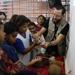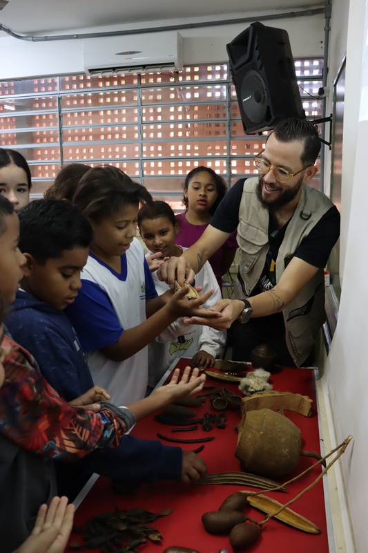Uma mesa com diversas sementes de árvores também foi montada para que os alunos pudessem ter contato direto com os materiais durante a oficina.