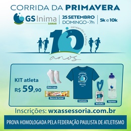 Araçatuba sediará, no dia 25 de setembro, a “Corrida da Primavera – 10 anos GS Inima SAMAR”, evento que celebrará a primeira década de concessão dos serviços de água e esgoto da cidade. Com distâncias de 5k e 10k, a corrida vai premiar corredores da categoria geral, do 1º ao 5º lugar, mas também vai entregar troféus aos moradores da cidade, do 1º ao 5º lugar, e faixas etárias do 1º ao 3º lugar nos 5k, além de medalhas para todos os participantes.