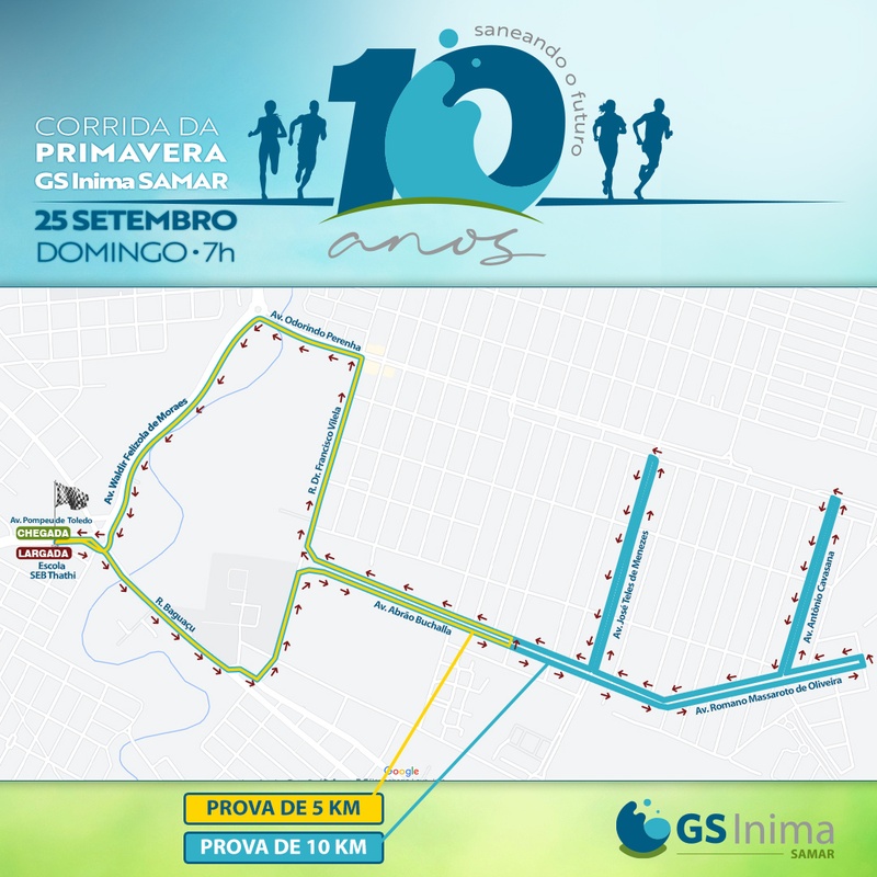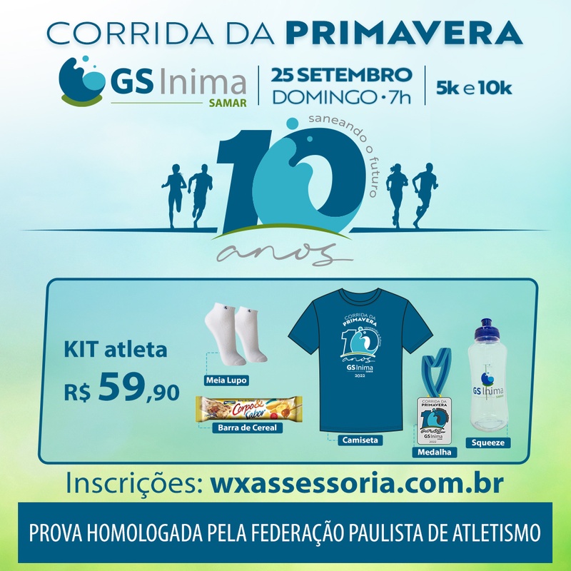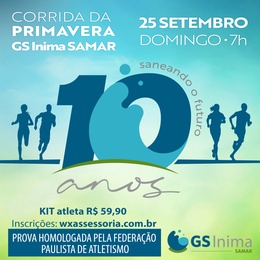 “Estamos organizando um grande evento para comemorar os 10 anos de concessão e nossa expectativa é de que seja um sucesso para que a corrida se consolide como um evento esportivo recorrente no calendário da cidade. Contamos com a participação da população e de grupos de corridas de toda a região para fazermos uma grande festa”, comenta o diretor-técnico da GS Inima SAMAR, Eduardo Caldeira.